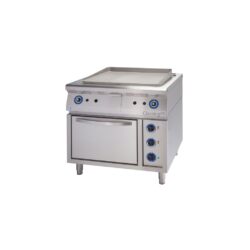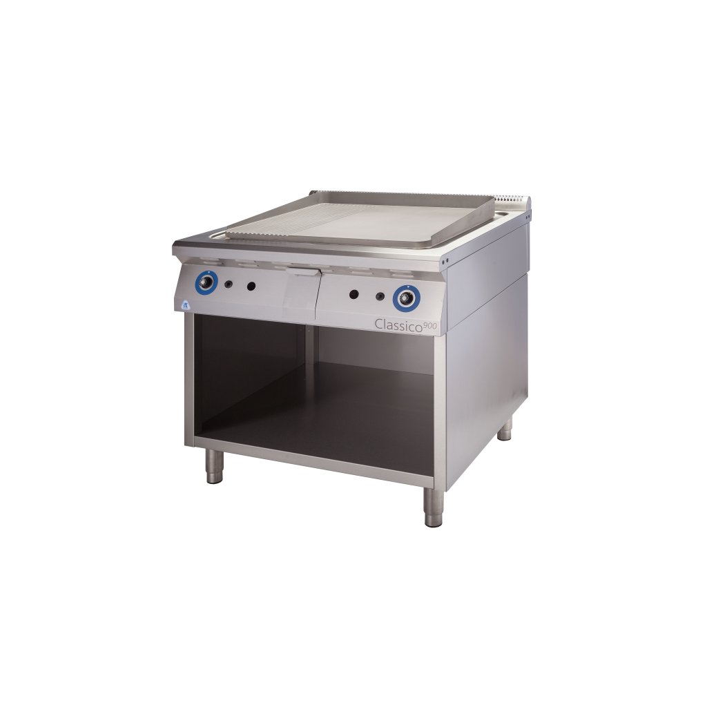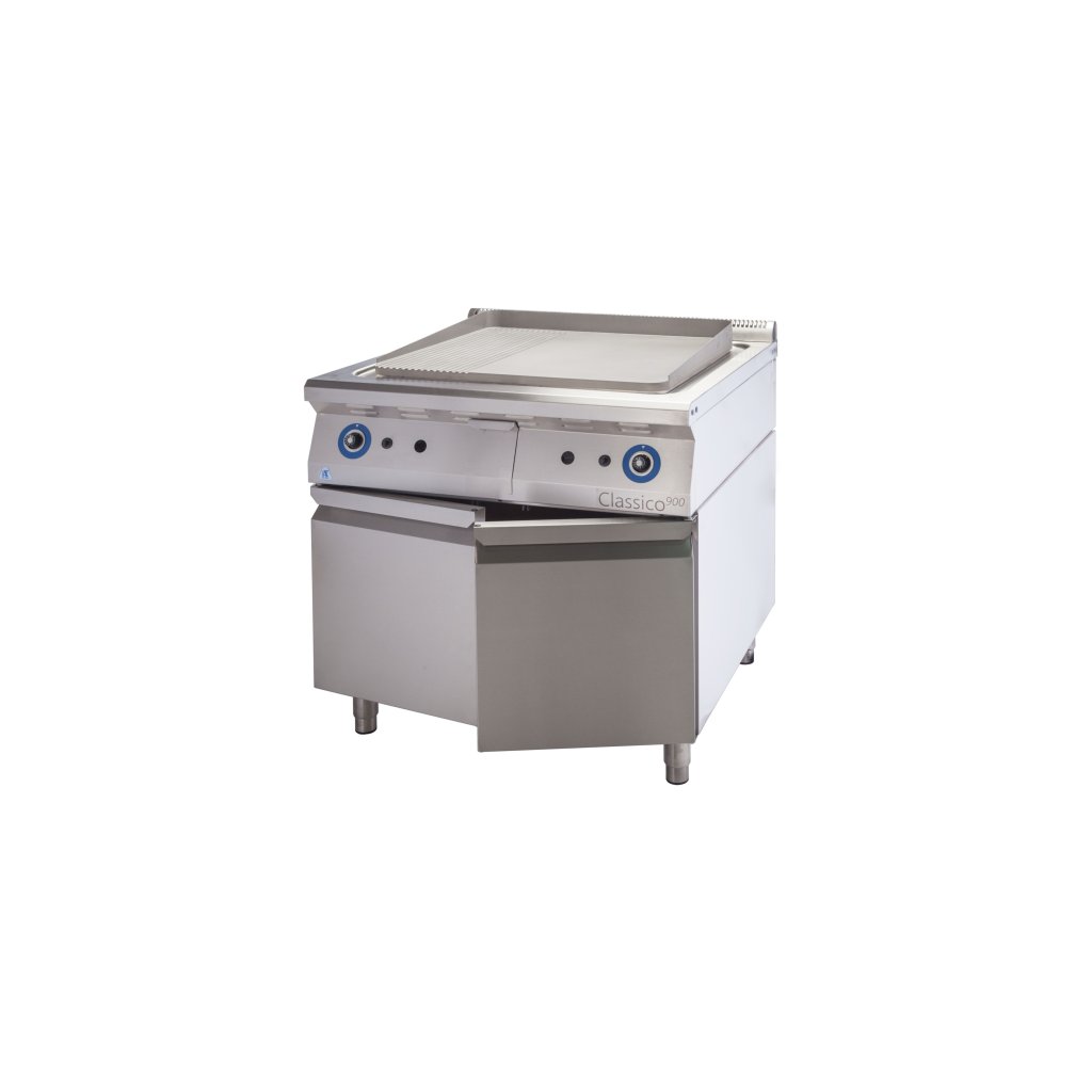 ALBA E-GP-4/900 Elektrická grilovacia doska Variant: F – ryhovanie 1/3 – voľný priestor Grilovacie dosky sú vyrábané z nehrdzavejúcej ocele 18/10. Skladajú sa z hornej pracovnej časti a podstavca. Hornú časť tvorí rám s vlastnou grilovacou doskou o sile 12 mm. Pri veľkých moduloch je gril. doska z jednej tretiny drážkovaná, pri polovičných modeloch je gril. doska celá hladká. V prednej časti rámu je žliabok s otvorom na odtok tukov do odkvapovej nádoby, ktorá je výsuvná a je umiestnená uprostred predného krytu.