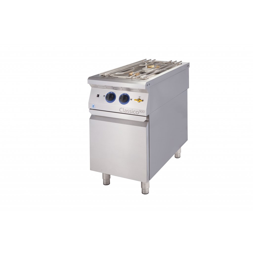 ALBA GC-2/900 Plynový sporák – 2 horákový Variant: FS (PB) Voľný priestor a police – propán – bután Plynové sporáky sú vyrábané z nehrdzavejúcej ocele 18/10. Skladajú sa z hornej varnej časti a podstavca. Flexibilný stavebnicový systém umožňuje individuálne zostavenie varnej časti a podstavca, prípadne je možné použiť varnú časť ako samostatný varný blok. Varidlovú časť tvorí rám s vaňou, v ktorej sú umiestnené horáky kryté mriežkou. Každý horák je vybavený zapaľovacou elektródou, zapaľovacím horáčikom a termoelektrickou poistkou. Podstavce sa vyrábajú v niekoľkých variantoch a sú vybavené štyrmi nastaviteľnými nožičkami.