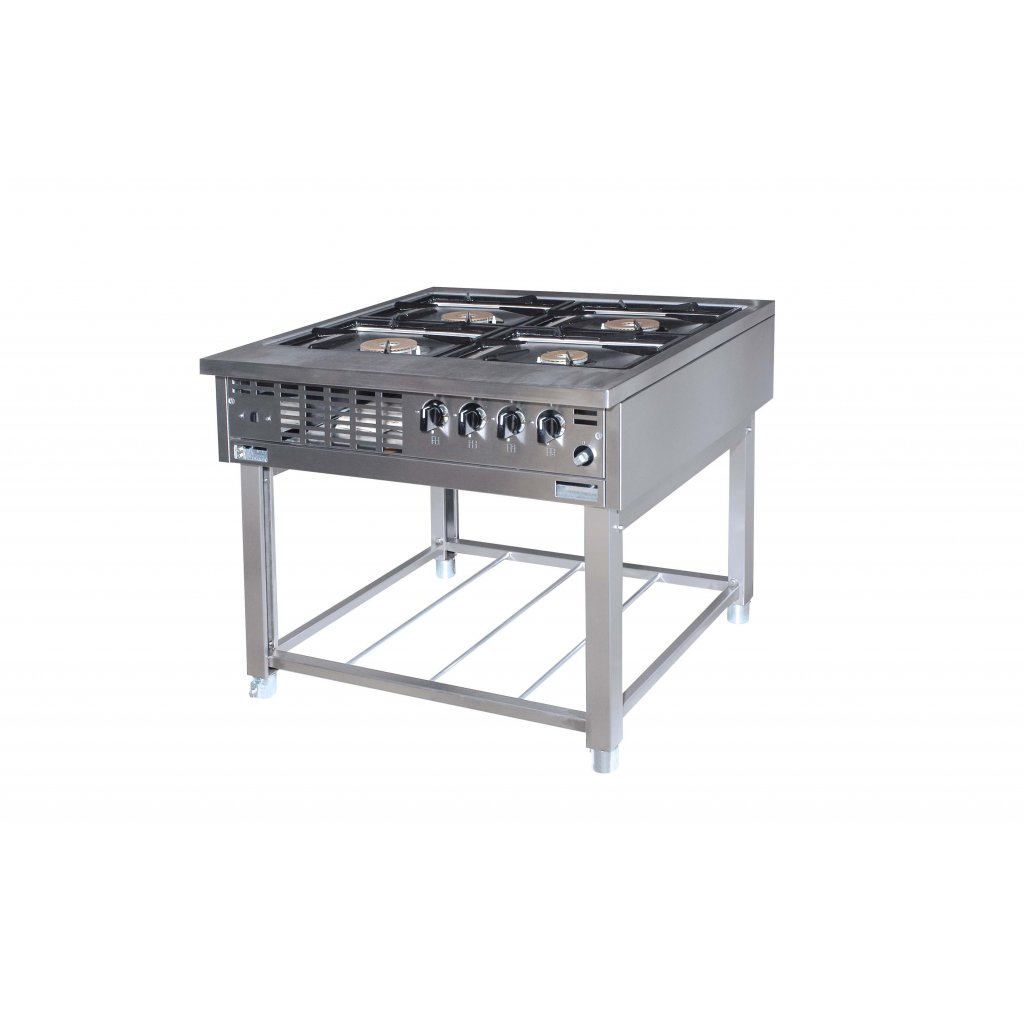 Výsuvná odkvapová misa z čela pre pretečené pokrmy. Pri sporáku nie je zadná zvýšená odvetrávacia mriežka – využitie priestoru až zadnej hrane výrobku. Celonerezová konštrukcia z kvalitnej potravinárskej ocele AISI 304 – EN 1.4301. Štyri plynové horáky vybavené termopoistkami. Samostatná regulácia každého horáka. Varidlo je opatrené všetkými nastavovateľnými nožičkami.