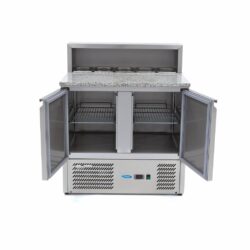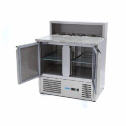 Táto profesionálna chladnička na prípravu pizze má chladiacu kapacitu 285 l, ktorá udrží suroviny v chlade čo najdlhšie. Za dvoma dverami z nerezovej ocele sa nachádza nastaviteľná polica, takže si môžete prispôsobiť usporiadanie presne podľa svojich predstáv. Je tiež možné objednať ďalšie police a pridať ich tam, kde je to potrebné. Môžete si dokonca objednať špeciálne zásuvky na cesto, ktoré udržia cesto na pizzu v chlade, kým ho nebudete potrebovať. Táto prípravná chladnička pracuje najlepšie pri okolitej teplote 32 °C. Má chladiaci systém, ktorý zahŕňa ventilátor, kompresor Zanussi a výparník s penou na troch stranách, a používa chladivo R600a, ktoré neobsahuje freóny. Chladiaci cyklus pracuje tak, aby bola tvorba ľadu obmedzená na minimum a. Pomocou digitálneho termostatu môžete nastaviť teplotu v rozmedzí 0 až 10 °C.