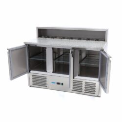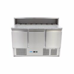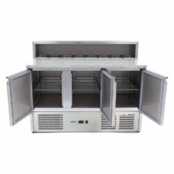 Táto profesionálna chladnička na prípravu pizze má chladiacu kapacitu 400 l, ktorá udrží ingrediencie v chlade čo najdlhšie. Za tromi dverami z nerezovej ocele sa nachádza nastaviteľná polica, takže si môžete prispôsobiť usporiadanie presne podľa svojich predstáv. Je tiež možné objednať ďalšie police a pridať ich tam, kde je to potrebné. Môžete si dokonca objednať špeciálne zásuvky na cesto, ktoré udržia cesto na pizzu vychladené, kým nie je potreba. Táto chladnička na prípravu pizze funguje najlepšie pri okolitej teplote 32 °C. Má chladiaci systém, ktorý zahŕňa ventilátor, kompresor Zanussi a výparník s penou na troch stranách a používa chladivo R600a, ktoré neobsahuje freóny. Chladiaci cyklus pracuje tak, aby bola zaistená minimálna tvorba ľadu a. Pomocou digitálneho termostatu môžete nastaviť teplotu v rozmedzí 0 až 10 °C.