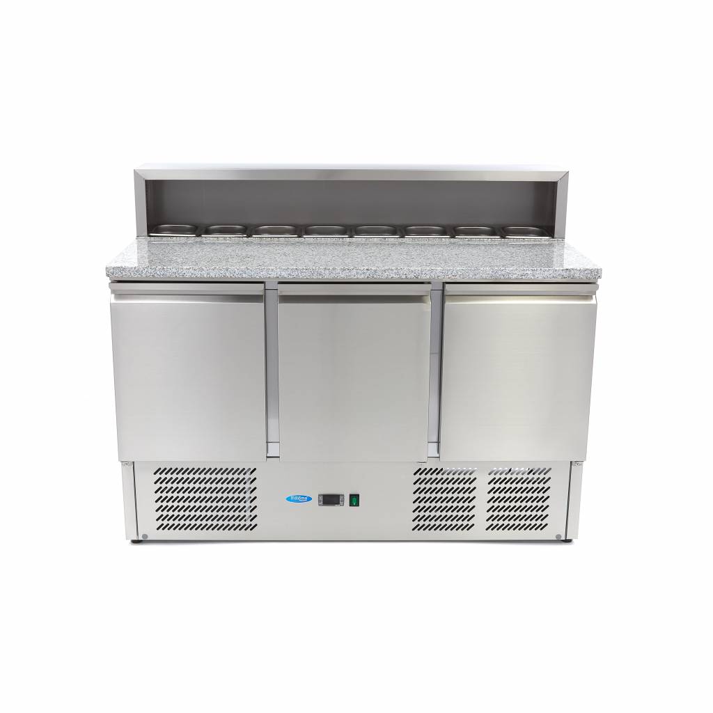 Pokiaľ každý deň pripravujete čerstvú pizzu s tými najchutnejšími náplňami, potom je táto krásna chladená prípravná stanica pre vašu kuchyňu nepostrádateľná. Vďaka žulovému pultu tejto chladničky na pizzu sa cesto nelepí a môže byť vyvaľkané a pripravené na použitie. Vďaka chladiacej vitríne, ktorá je pripevnená na hornej strane, si môžete byť istí, že všetky vaše obľúbené náplne sú nielen na dosah, ale aj zostanú chladné až do poslednej sekundy. Tento prémiový kuchynský spotrebič sa dodáva aj s nerezovými podperami na uloženie GN nádob, hoci nádoby a veká nie sú súčasťou balenia. Tie je možné objednať samostatne prostredníctvom internetového obchodu.