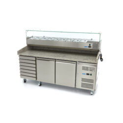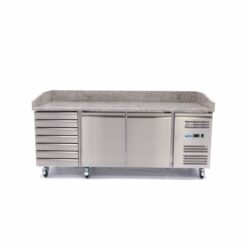 Pokiaľ každý deň pripravujete čerstvú pizzu s tými najchutnejšími náplňami, potom je táto krásna chladená prípravná stanica pre vašu kuchyňu nepostrádateľná. Vďaka veľkému žulovému pultu tejto chladničky na prípravu pizze sa cesto nelepí a môže byť vyvaľkané a pripravené na použitie. Aby bola prípravná chladnička na pizzu kompletná, je možné objednať samostatnú chladiacu vitrínu s hornou časťou, takže budete mať po ruke aj všetky prílohy na pizzu. Tento prémiový kuchynský spotrebič sa dodáva aj s nerezovými podperami na uchytenie GN nádob, hoci samotné nádoby a veká nie sú súčasťou dodávky. Tie je možné objednať samostatne prostredníctvom internetového obchodu. Je však vybavený kolieskami a brzdou pre ľahký pohyb.