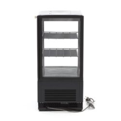 Táto robustná chladiaca vitrína má objem 58 litrov. Vďaka štyrom skleneným oknám a vstavanému LED osvetleniu sú výrobky prezentované atraktívnym a profesionálnym spôsobom pre všetky gastronomické podniky. Vnútri sú dve ľahko nastaviteľné police, takže do tejto vitríny môžete uložiť takmer ľubovoľne veľký výrobok. Ďalšie police je možné taktiež ľahko objednať. Pretože je minivýstavka vybavená zámkom, je možné ju umiestniť aj na bar alebo pult bez toho, aby ste sa museli obávať, že sa hostia obslúžia sami.