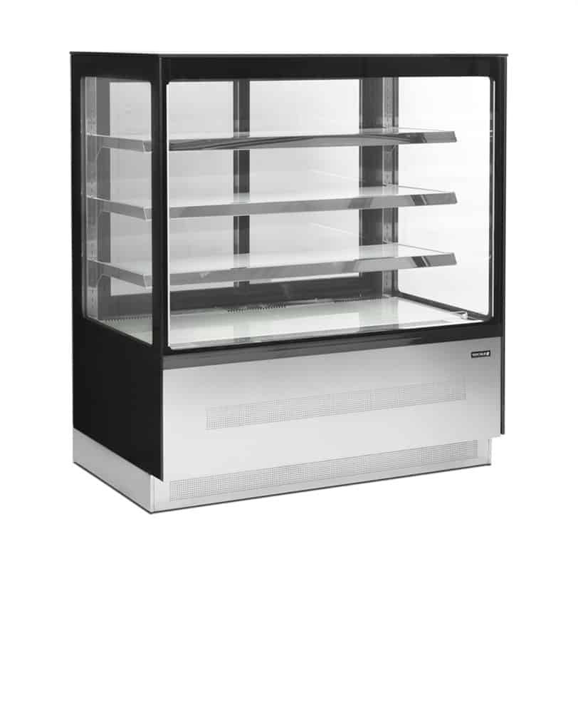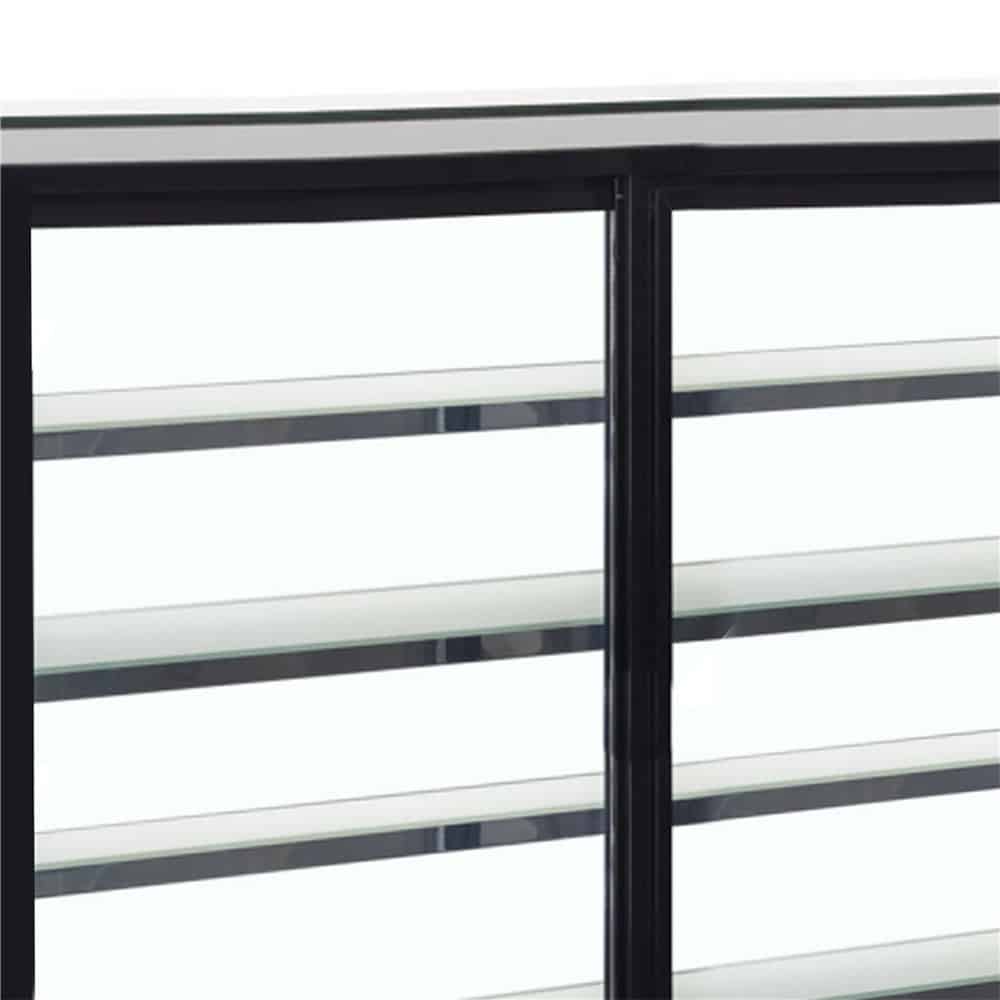 nadštandardný priestor na policiach, rám z nerezovej ocele a lesklého čierneho skla, dvojité sklo, predné sklo s ochranou proti zahmlievaniu, LED osvetlenie pod každou policou, zadné presklené posuvné dvere, ventilované chladenie, rovná presklená vrchná časť