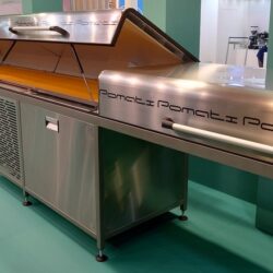 CHLADIACI TUNEL POMATI, ktorý je špeciálne navrhnutý a vyrobený na chladenie produktov, ako sú čokoládové veľkonočné vajíčka, sušienky a polievané sladkosti, pralinky…. je ideálny pre remeselné aj priemyselné továrne. Teplý produkt je dopravovaný do tunela dopravným pásom, kde je ochladzovaný nízkoteplotným núteným vzduchom. Chladiaci systém a pásový dopravník sa aktivujú ručnou manipuláciou s ovládacím panelom. Materiál: Kompletne vyrobené z nerezovej ocele AISI 304 Dopravný pás: z potravinárskeho, nárazuvzdorného polyuretánu Mechanické vlastnosti: Samovyrovnávacie valčeky s bezpásovým mechanizmom – Automatické odmrazovanie ohriatym plynom Chladiaca jednotka – Chladenie s uzavretou cirkuláciou vzduchu om pridaním 90° a 180° modulu. Svetlá výška tunela je 132 mm Pripojenie: 400V / 50 Hz 3V 5 pól Pripojenie vzduch: pracovný tlak 4 bar / pri 12 cykloch 2,4l / min Príkon: 2,4 – 5,5 kW podľa dĺžky tunela Šírka pásu: 320mm 6 metrov Rozstup nôžok: 560mm Šírka tunela celková: 657mm Pracovná výška pásu: 1029mm – nastaviteľné nôžky pre vyrovnanie menších nerovností podlahy a perfektné napojenie na ďalšie stroje Tunel sa skladá (podľa jeho celkovej dĺžky sa budú meniť počty jednotlivých častí) z: