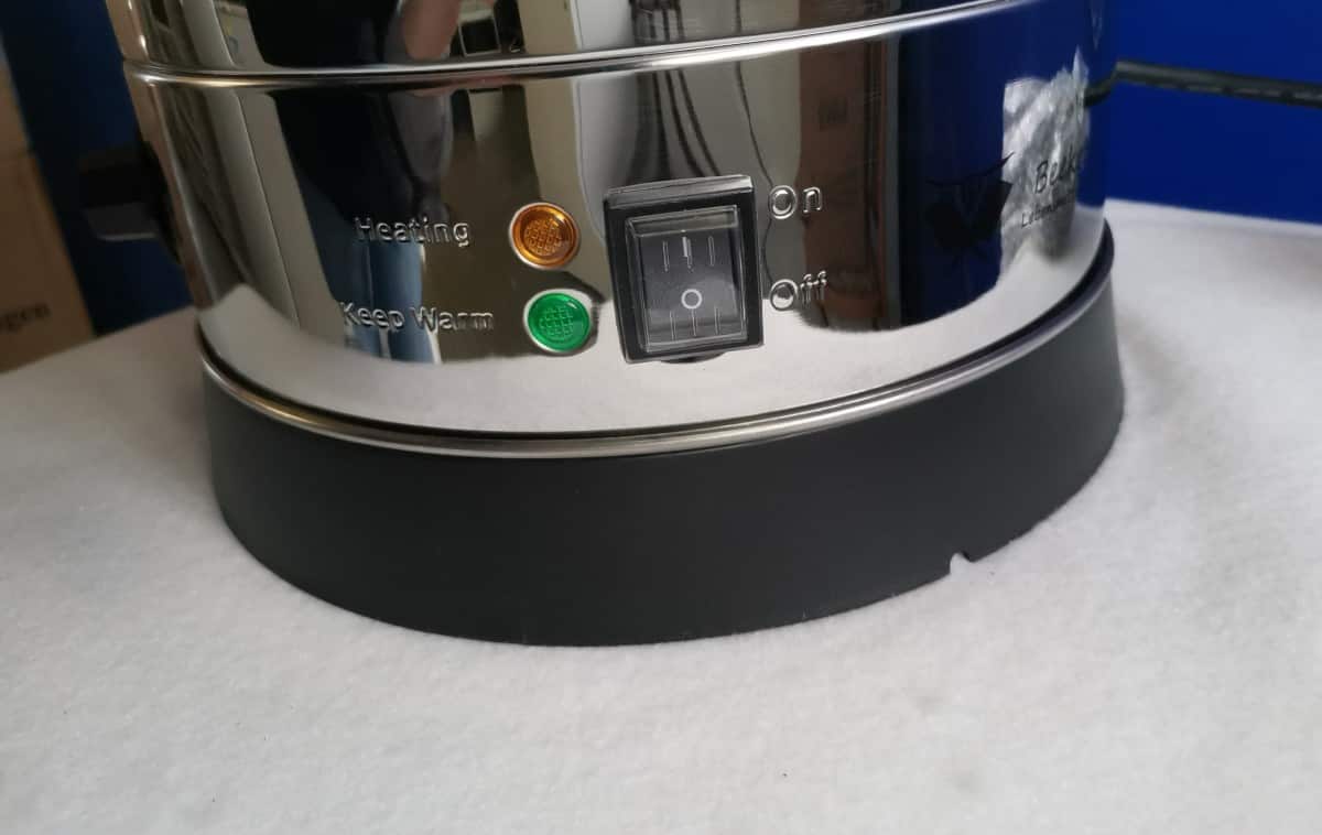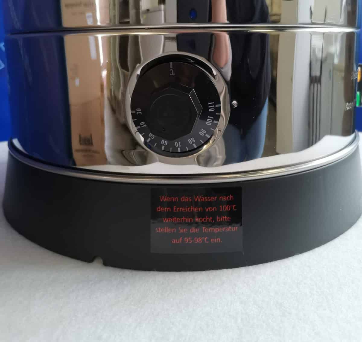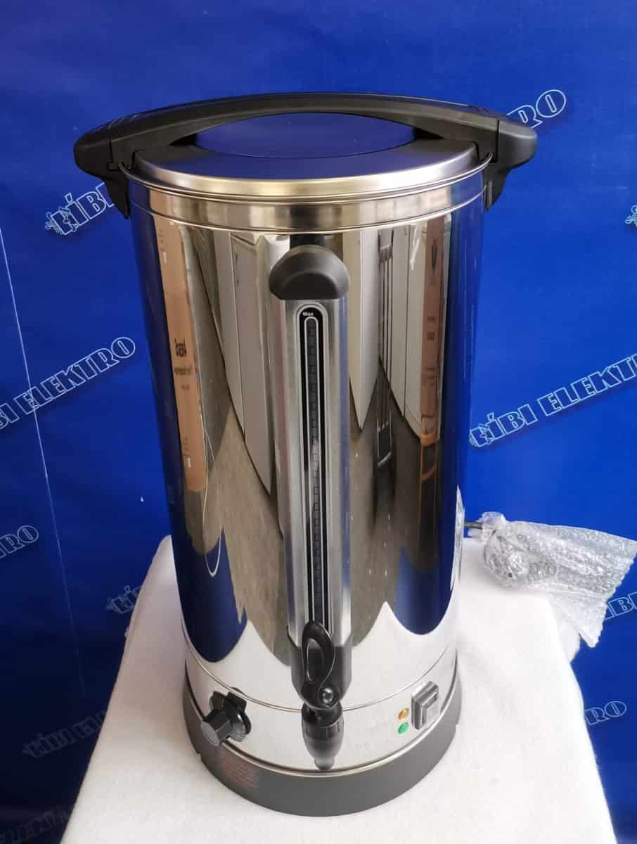 Ideálne pre prípravu väčšieho množstva čaju, kávy i vareného vína Telo z nerezovej ocele Nastaviteľná termostat 30 ° C až 110 ° C Výkon 2500W Vnútorný priemer 29 cm Výška 64,5 cm Celkový priemer 37,5 cm Napájanie 220 V Dĺžka prívodného kábla udržiavanie teploty nápojov Skryté výhrevné teleso Plynulá regulácia teploty Vodoznak pre kontrolu množstva Ochrana proti prehriatiu Veko s bezpečnostným zámkom Koch-Stop Jednoplášťový Objem 30 litrov