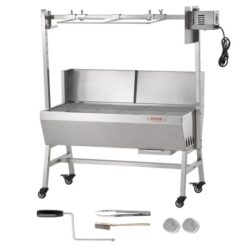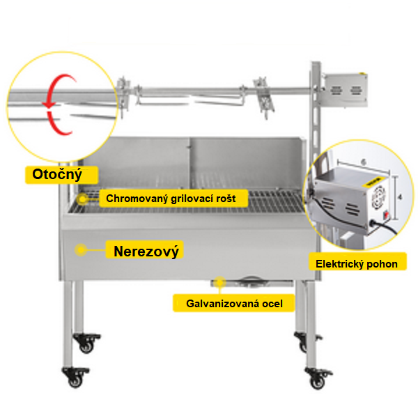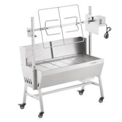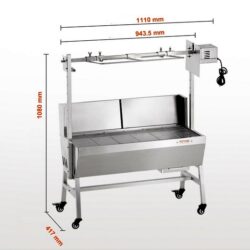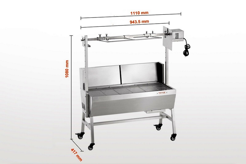 Výkon motora: 42W Otáčky motora: 4 ot./min Maximálna nosnosť: 60 kg – 40kg ražeň + 20 kg rošt Dĺžka čepele: 94,4 cm Nastaviteľná výška ražne: 11,5-35,5 cm (min až max od povrchu grilu) – 4 nastaviteľné výšky Rozmer Hmotnosť položky: 20,1 kg Veľkosť produktu: 1110x417x1080 mm