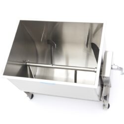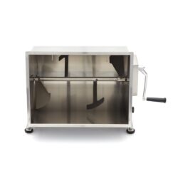 Mixovanie mäsa v tomto nerezovom mixéri je veľmi jednoduché: stačí otvoriť veko a naplniť nádrž požadovaným množstvom mäsa alebo ryby. Nádrž má objem 50 litrov a je vhodná na spracovanie 35-43 kg mäsa alebo rýb. Po pridaní hlavnej suroviny môžete pridať korenie, ako sú bylinky, orechy alebo zelenina. Aby ste všetko dobre premiešali, otáčajte rukoväťou, kým nedosiahnete správnu štruktúru mäsa alebo náplne. Mixér na mäso sa môže otáčať v dvoch smeroch. Výklopná nádrž je veľmi praktická, keď chcete obsah vybrať, a ponúka aj veľkú výhodu pri čistení. Pre dobrú priľnavosť na takmer akomkoľvek povrchu je mixér na mäso vybavený štyrmi gumovými nožičkami.