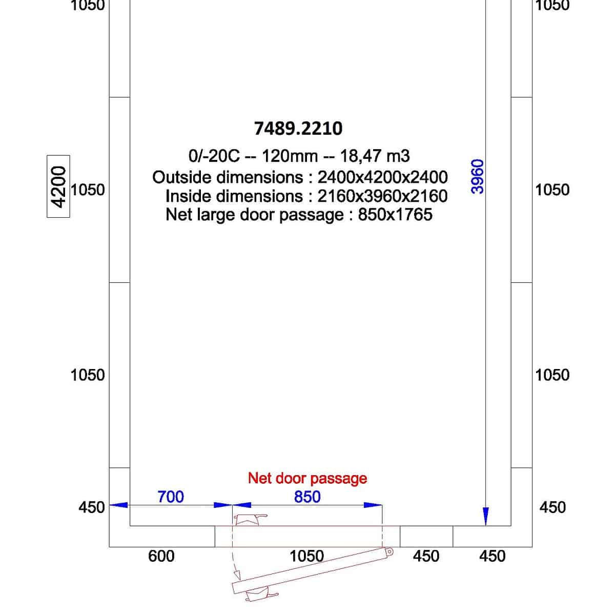 Kľúčové vlastnosti: Systém zámku : hákový BEZ CHLADIACEJ JEDNOTKY – pre správne zvolenie jednotky nás prosím kontaktujte Podlaha z nerezovej ocele 430 s hrúbkou 1 mm Mraziace boxy s tlakovým ventilom a vyhrievaním dverí Obojstranné dvere Stavebnicový systém Typ: Pro Line Šírka 4200 Výška (mm): 2400 Hrubá hmotnosť (kg): 738 Kapacita (m3): 18,4 Vnútorné rozmery ŠxHxV (mm): 2160x3960x2160 Uzamykateľné: Áno Dvere na pántoch vľavo/vpravo : Pánty vpravo 850 Hrúbka izolácie (mm): 120 Značka: COMBISTEEL