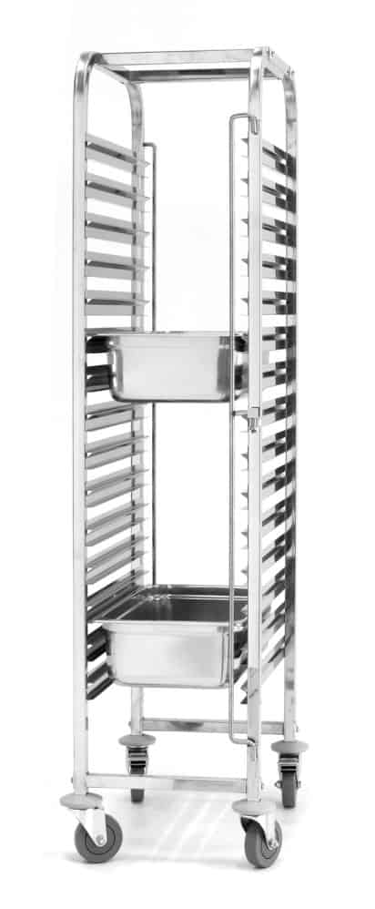 Pre nádoby 15 x GN 1/1 Vzdialenosť medzi úrovňami: 80 mm Ochrana proti pádu kontajnera na oboch stranách 4 otočné kolieska, 2 s brzdou Nosnosť vozíka s rovnomerným rozložením hmotnosti 150 kg