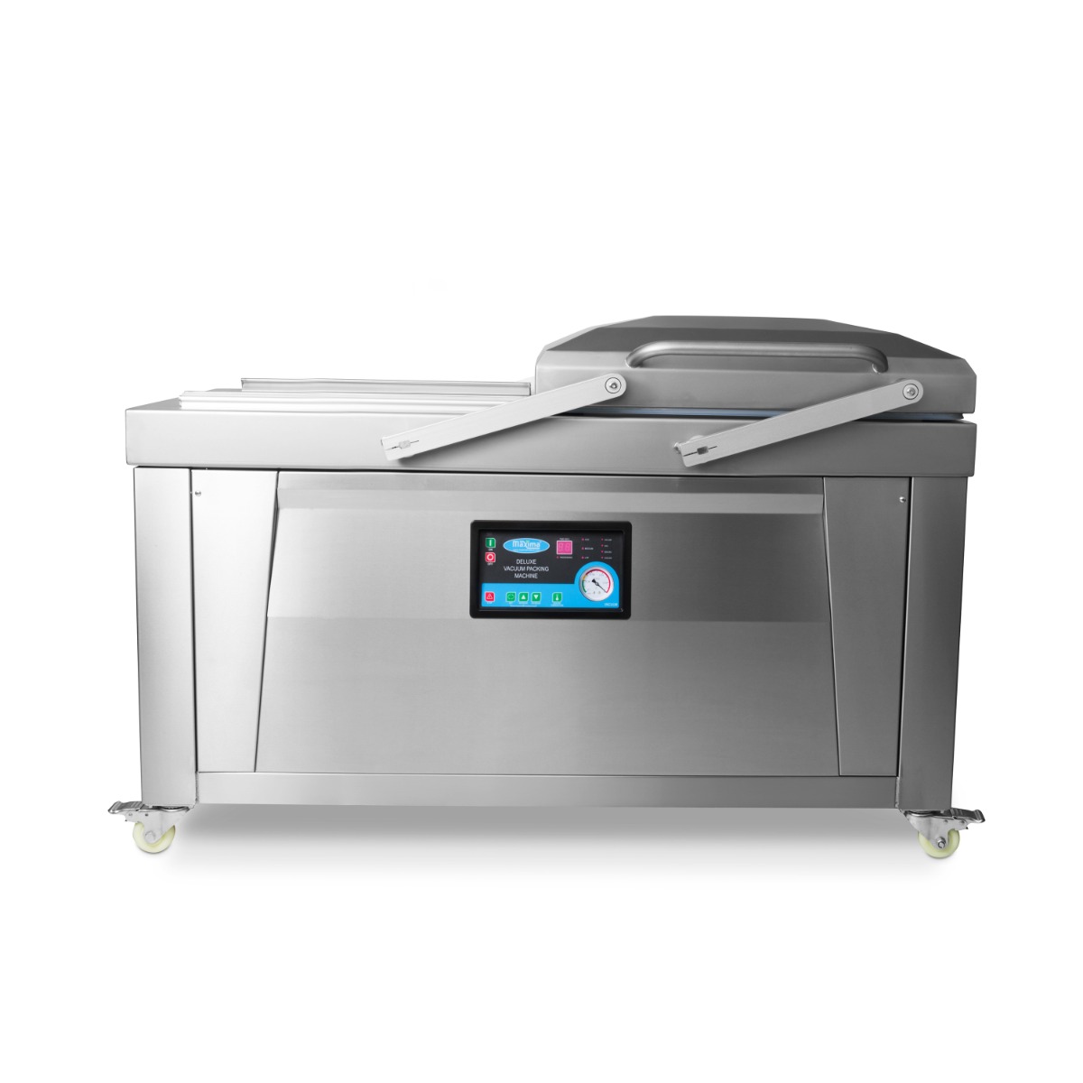 S týmto profesionálnym vákuovým baliacim strojom sú výrobky balené úplne automaticky. Dvojkomorový systém sa ľahko ovláda pomocou užívateľsky prívetivého ovládacieho panelu. Stroj je plne nastaviteľný tak, aby vyhovoval vašim potrebám. Môžete napríklad nastaviť dobu uzatvárania, ale aj teplotu, vákuový tlak a dobu chladenia. Použitie tohto baliaceho stroja je jednoduché: vložte potravinársky výrobok do vákuového vrecka a umiestnite ho na tesniacu lištu otvorom nahor. Zatvorte veko a nastavte stroj. Tento stroj je ideálny na uzatváranie veľkých potravín, ako sú kusy mäsa, vďaka dvojitej uzatváracej lište s dĺžkou 60 cm.