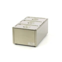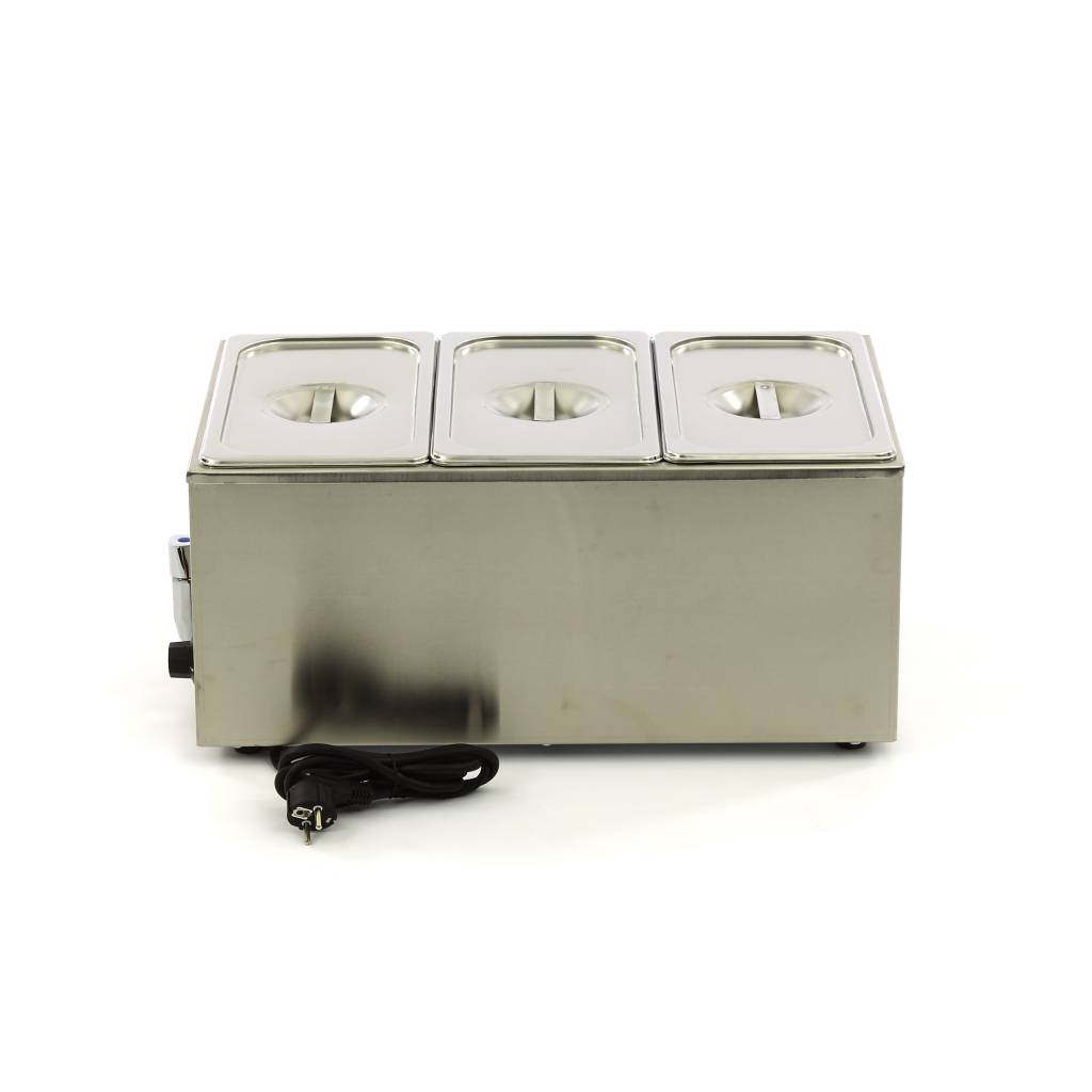 Tento bain marie je ideálny na ohrev čokolády, omáčok, mliečnych výrobkov a zmesí. Vďaka krásne spracovanému telu a bezšvovému vnútornému okraju je práca s týmto profesionálnym bain marie bezpečná. Vypúšťací kohútik uľahčuje vyprázdnenie zásobníka bain marie. Termostat má teplotný rozsah od 30 do 95 ºC. Svetelné kontrolky ukazujú, kedy voda dosiahla správnu teplotu. Bain marie je možné používať s GN podnosmi s maximálnou výškou 15 cm. Tento kuchynský spotrebič sa dodáva s 3 x 1/3 GN nádobami a vekami (15 cm).