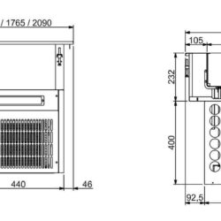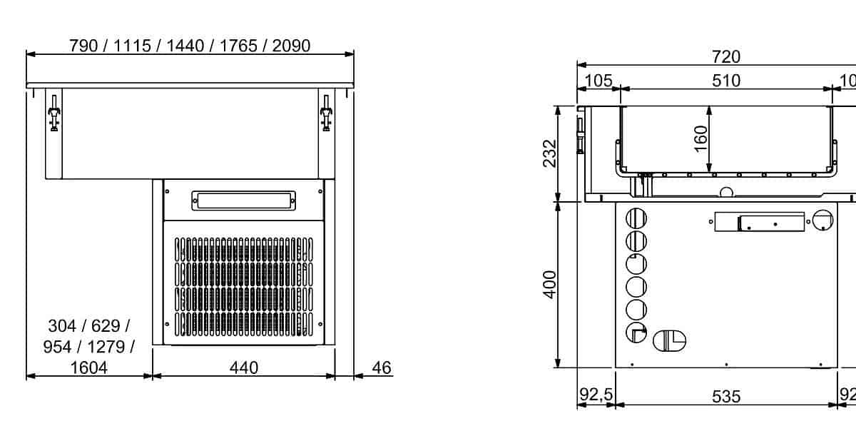 Šírka (mm):790 Hĺbka (mm):720 Výška (mm):632 Napätie (Volt):230 Frekvencia (Hz):50/60 Ampér (A):1,3 Výkon (kW):0,235 Chladiaci prostriedok:290 R Rozsah teplôt (°C):+4/+8 Inštalačná šírka (mm):765 Inštalačná hĺbka (mm):690 Obsah GN:2/1 Osvetlenie:Nie Chladenie statické / ventilované:Statický